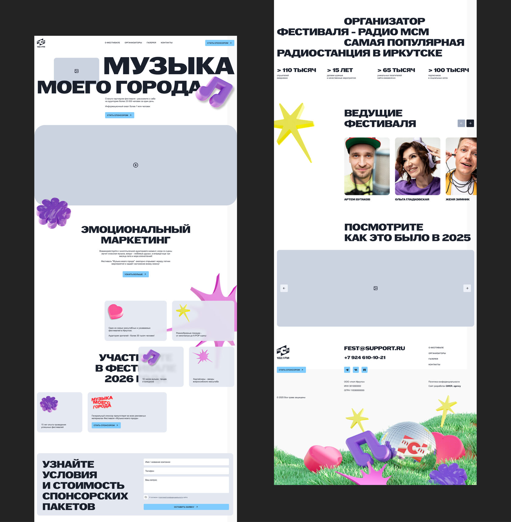 Разработать и запустить яркий, информативный лендинг для фестиваля «Музыка моего города» в сжатые сроки — всего за 3 недели.