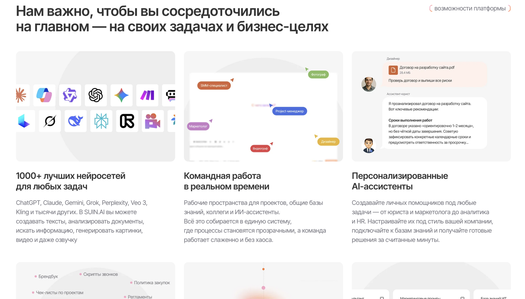 Все это — и есть SUIN.AI. Это единое окно доступа к более чем 1000 нейросетей, включая ChatGPT, Claude и Gemini, с удобной оплатой российскими картами и без необходимости использовать VPN.