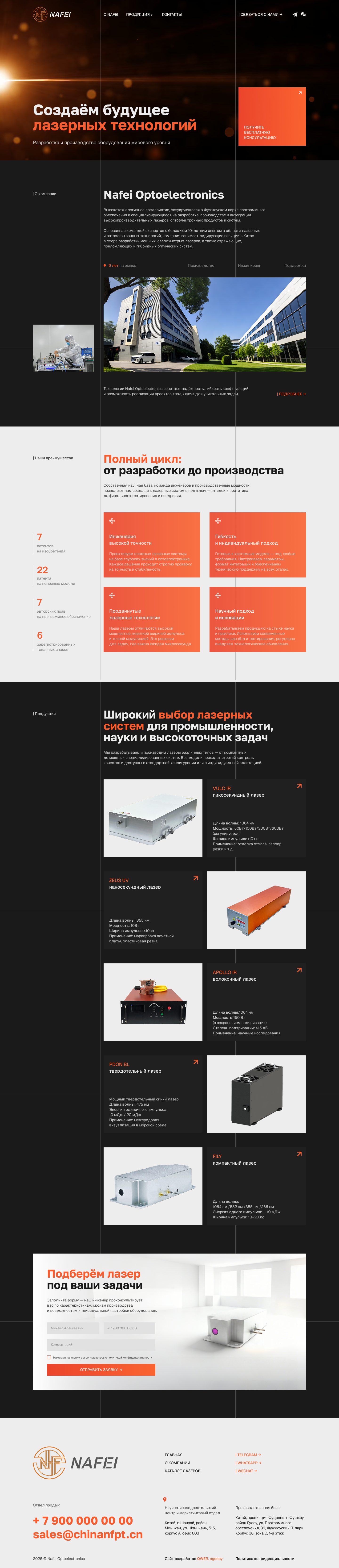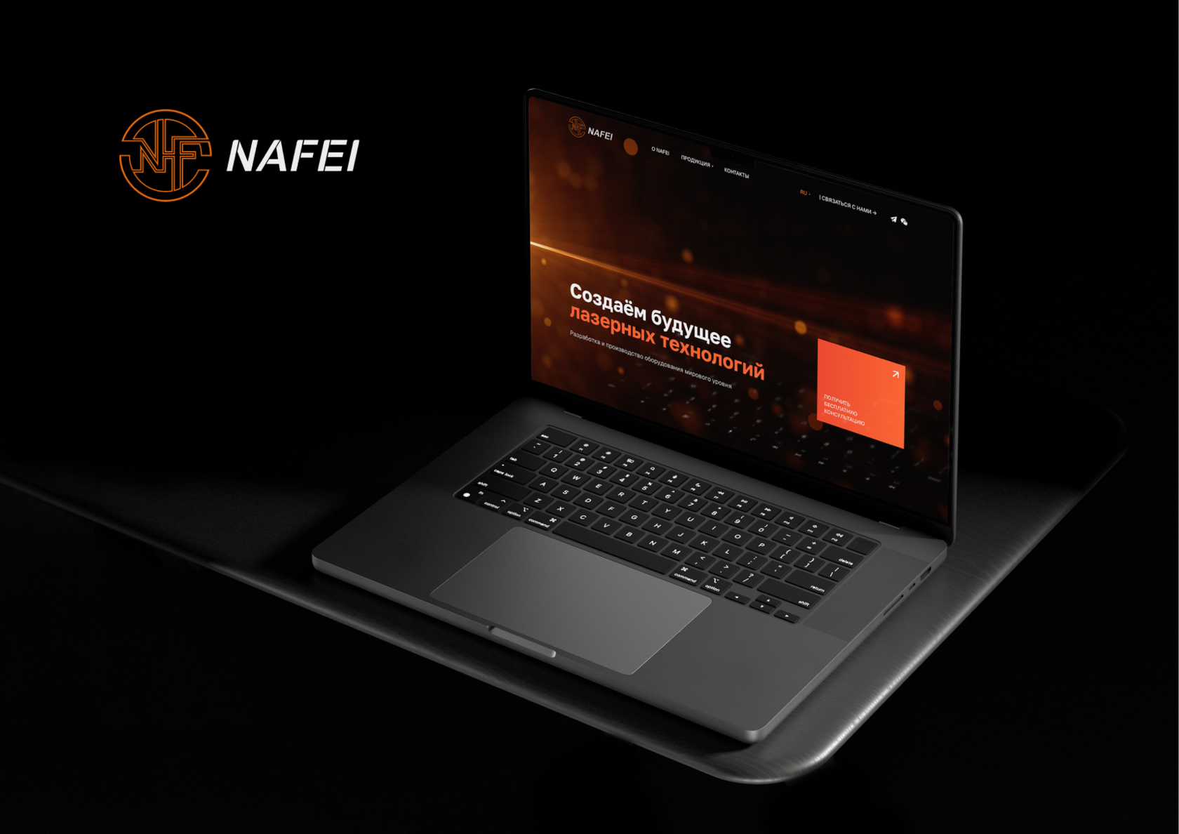 Для сайта Nafei Optoelectronics мы выбрали современную hi-tech эстетику с тёмным UI, чтобы подчеркнуть технологичность и серьёзность бренда.